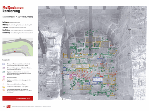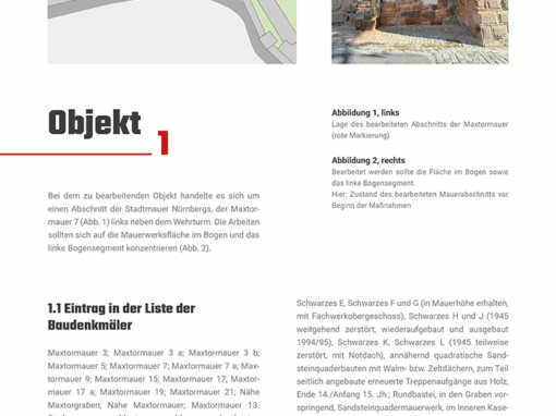 Der Abschnitt Maxtormauer 7 der Stadtmauer Nürnbergs ist Teil der Burg und erwies sich als echte Herausforderung: Die Substanz von Sandstein und Ziegelergänzungen war zum Teil schwerst geschädigt. Schwarze Auflagerungen, Pflanzenbewuchs, unsachgemäße Altergänzungen und ähnliches zogen die Mauer sehr in Mitleidenschaft.