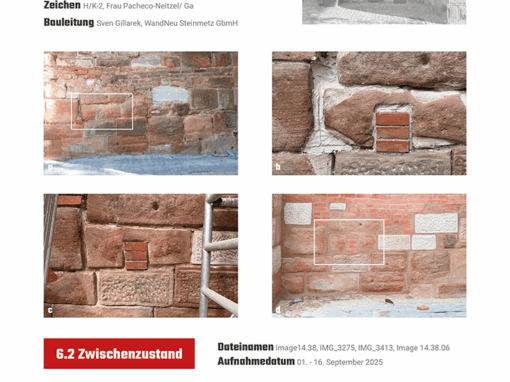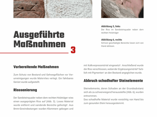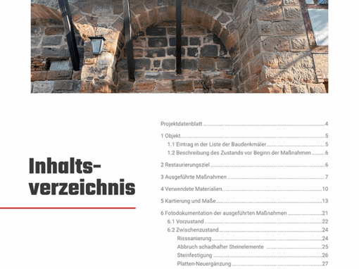 Hier zeigen wir Ihnen ein paar Vorher-Nachher-Bilder und einen Auszug aus unserer 65 Restaurierungsdokumentation einschließlich Maßnahmenkartierung, um einen Eindruck zu vermitteln, wie detailreich und spannend Denkmalpflege sein kann!
