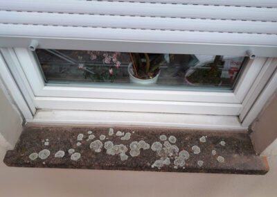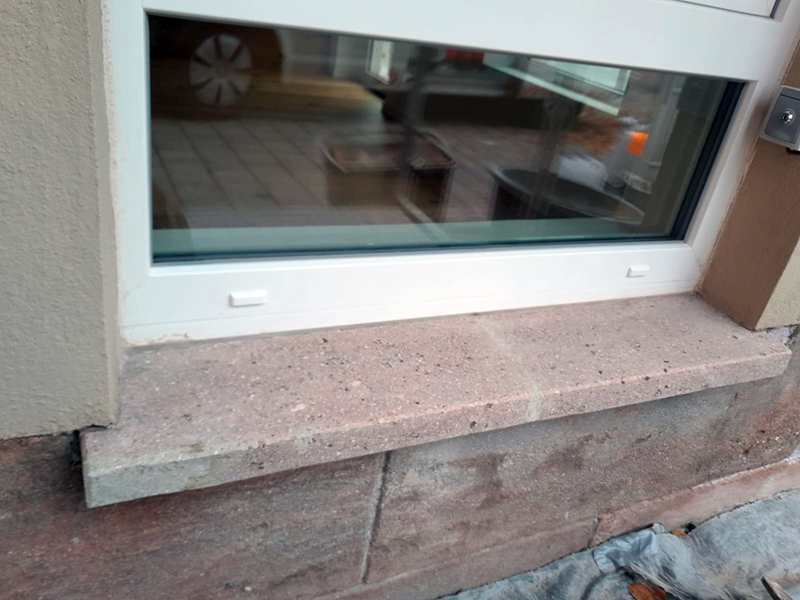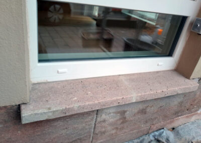 Kunststeinelemente in Form von Fensterbänken wurden gereinigt und zweimal geschliffen. Auch hier wurden die Risse geöffnet. Anschließend wurden sie grundiert und mit nach Mustervorlage angefertigtem Kunststeinergänzungsmörtel ergänzt. Ebenfalls mit Ergänzungsmörtel repariert wurden Verlustzonen.
