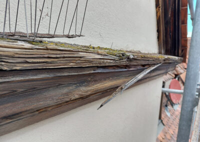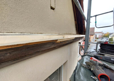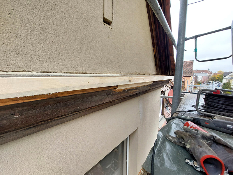 Schwer geschädigte Bereiche im Holzgurtgesims wurden ausgetauscht. Die verbleibenden Bestandsholzelemente wurden geschliffen und von losen Farbauflagerungen befreit. Die neuen Hölzer wurden im Bestandsfarbton vorgrundiert, bevor die Hölzer einen Lasuranstrich im Farbton Ebenholz erhielten.