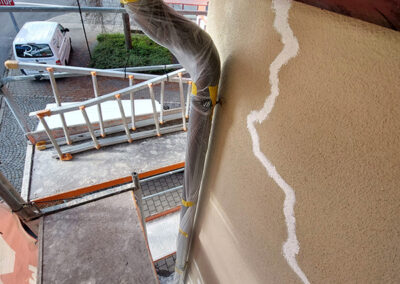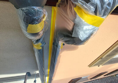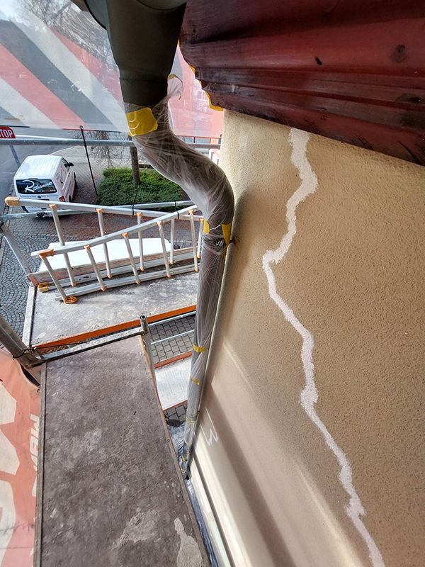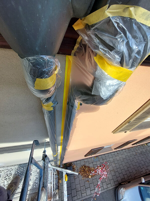 Vor dem Abdecken wurden Fenster und Fugen gereinigt. Anschließend wurden die Fenster, Außentüren und angrenzende Flächen mit Folie abgedeckt, wobei die Stöße verklebt wurden. Auch die Regenfallrohre und andere empfindliche Elemente an der Fassade wurden geschützt.