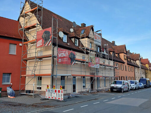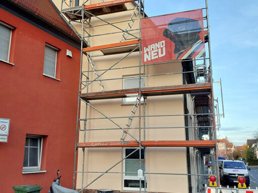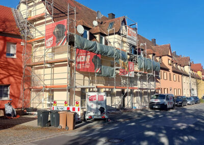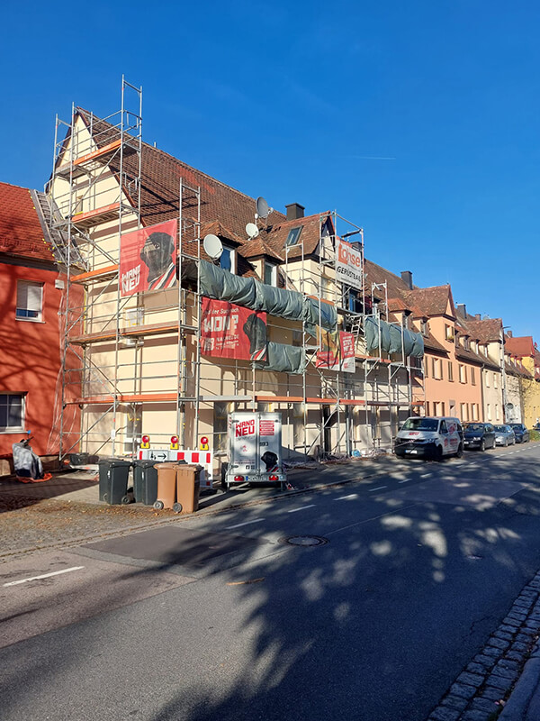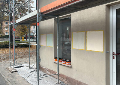 Ein Stahlrahmengerüst wurde aufgestellt. Zum Schutz von Bestand und Gehwegsflächen wurde Malervlies verlegt.