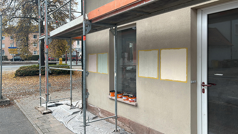 Vier Farbmuster wurden angebracht. Nachdem die Wahl auf den Farbton Onyx gefallen war, erhielt die Fassade ihren zweifachen Anstrich bestehend aus Zwischenbeschichtung und Deckanstrich.